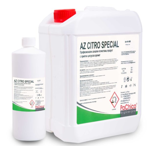 AZ CITRO SPECIAL M is a product for cleaning machines. It removes persistent contamination on various floor surfaces, polished cement, walls, window and door frames, enamelled surfaces and synthetic leather. Suitable for aluminium, PVC and precious metals. It forms a surface protection film.