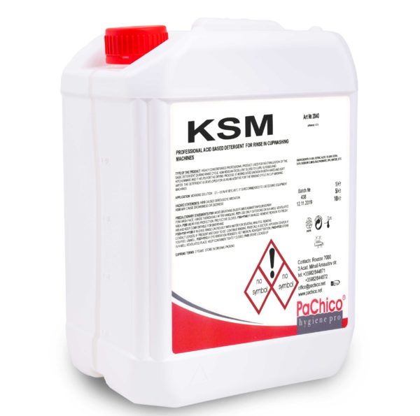 KSM is a professional glasswasher rinse aid. Its formula ensures that water easily drains off the glasses because of its spreading effect. The product ingredients accelerate easy drying without water marks, and produce brilliant glass shine.