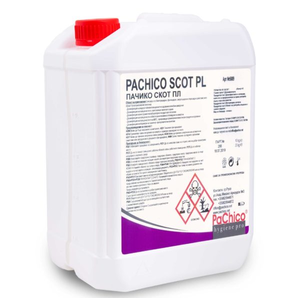 PACHICO SCOT PL has bactericidal, fungicidal, virucidal and sporicidal effects. It is recommended to use on water resistant surfaces in medical and health establishments, on surfaces in contact with food, laboratory instruments, glassware and plastic ware by immersion; surfaces in intensive stock breeding facilities, etc.